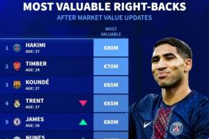 最新足坛右后卫身价排行榜:阿什拉夫8000万欧元最高,廷伯排第二